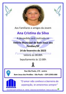 ANA CRISTINA DA SILVA 13 de fevereiro de 202313 de fevereiro de 2023| Unidade Bom JesusUnidade Bom Jesus| 0 Comments | 18:07 Categories: 1 thought on “ANA CRISTINA DA SILVA” Meus pêsames aos familiares e amigos. Que ela descanse em paz e que Deus conforte o coração de vocês. Responder Leave a Reply Cancelar respostaO seu endereço de e-mail não será publicado. Campos obrigatórios são marcados com *Comentário Nome * E-mail * Site Salvar meus dados neste navegador para a próxima vez que eu comentar.
