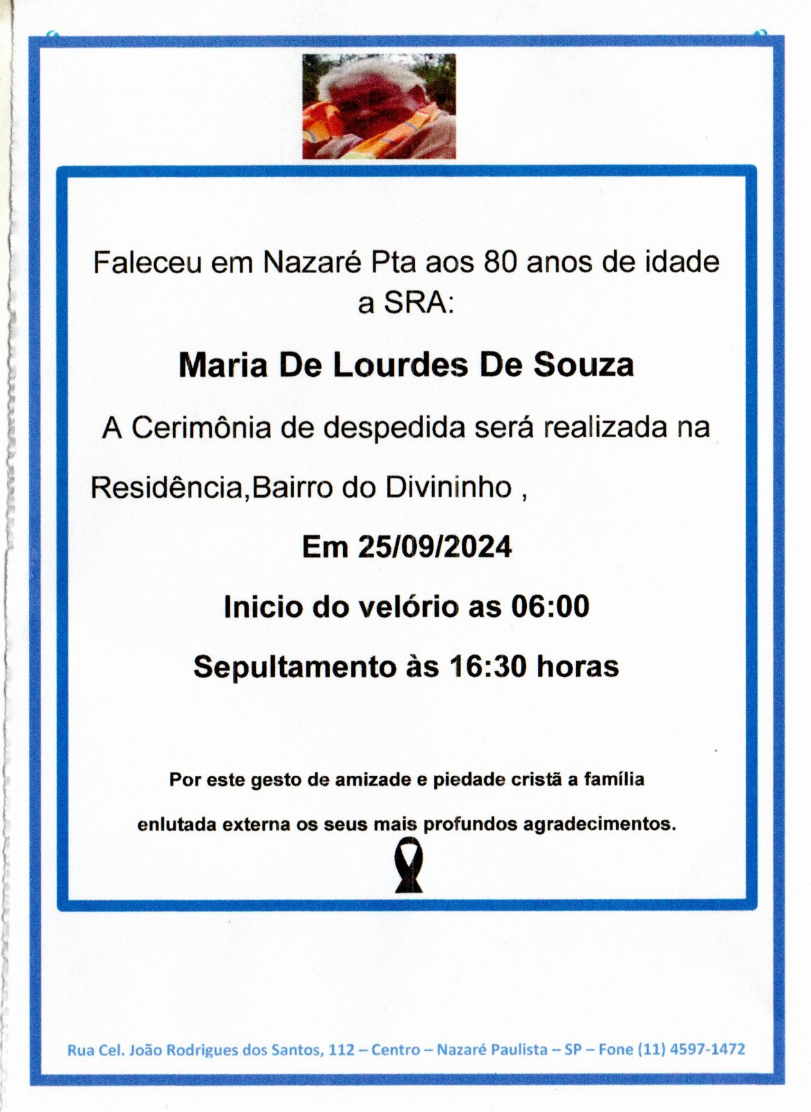 MARIA DE LOURDES DE SOUZA 2 de outubro de 20242 de outubro de 2024| Unidade Nazaré PaulistaUnidade Nazaré Paulista| 0 Comment | 14:47 Categories: Leave a Reply Cancelar respostaO seu endereço de e-mail não será publicado. Campos obrigatórios são marcados com *Comentário Nome * E-mail * Site Salvar meus dados neste navegador para a próxima vez que eu comentar.